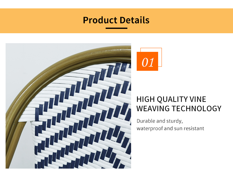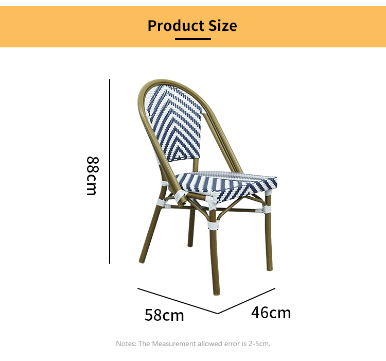 A perfect blend of French elegance and modern design, this outdoor French rattan chair features an aluminum alloy frame and exquisite wood grain finish. The seat, backrest, and cushions are crafted with woven rattan, ensuring breathability and comfort. Designed specifically for outdoor cafes and bars, it is not only weather-resistant and durable, adaptable to various outdoor environments, but also perfectly combines classic French style with modern sensibilities, elevating the ambiance of any relaxation space. Whether sharing pleasant moments with friends or enjoying a cup of coffee, this rattan chair brings comfort and elegance!