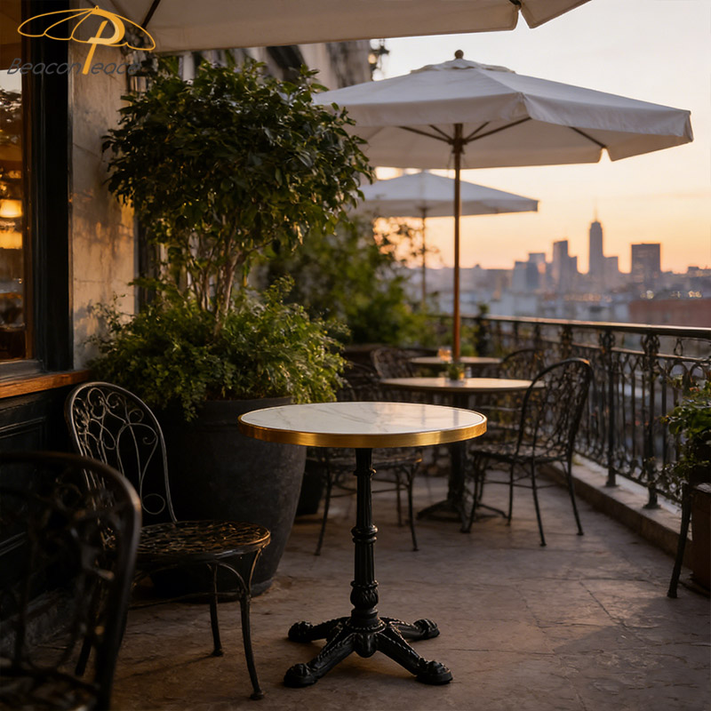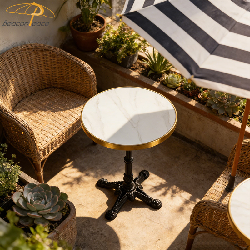 This BP3874 outdoor coffee side table will add endless charm to your leisure time. Its elegant marble tabletop showcases natural textures and a luxurious feel, becoming a visual focal point in your outdoor space. The lightweight aluminum alloy base ensures stability and durability, while also giving the overall design a modern and stylish touch. Whether in your garden, balcony, or patio, it will make every coffee moment beautiful and comfortable.