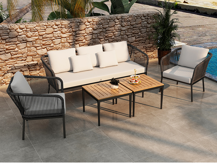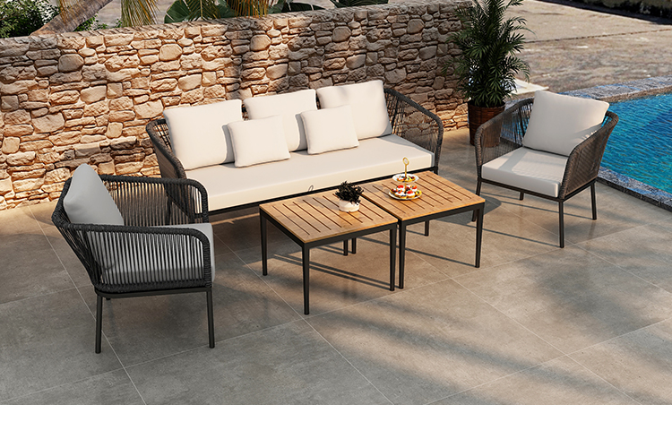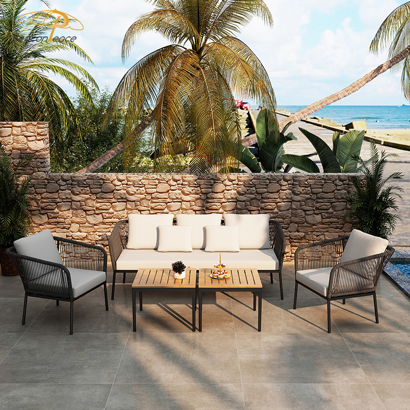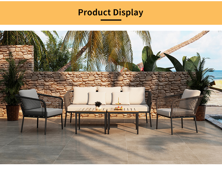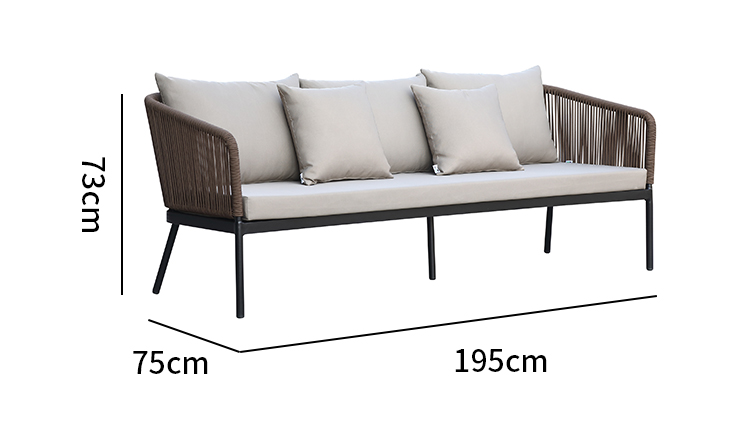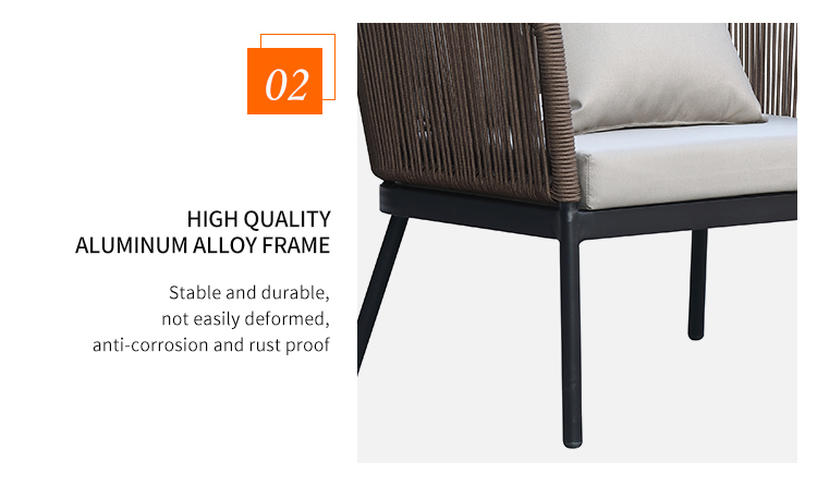 This outdoor aluminum alloy rattan rope sofa set is made of high-quality aluminum alloy and environmentally friendly rattan rope. It is durable and UV-resistant and suitable for all weather conditions. It includes 2 single sofas and 1 3-person sofa, plus 2 plastic-wood desktop aluminum alloy chairs, providing you with a comfortable and stylish outdoor leisure space. Waterproof cushions and easy-to-clean materials allow you to easily maintain and enjoy every moment of peace and relaxation.